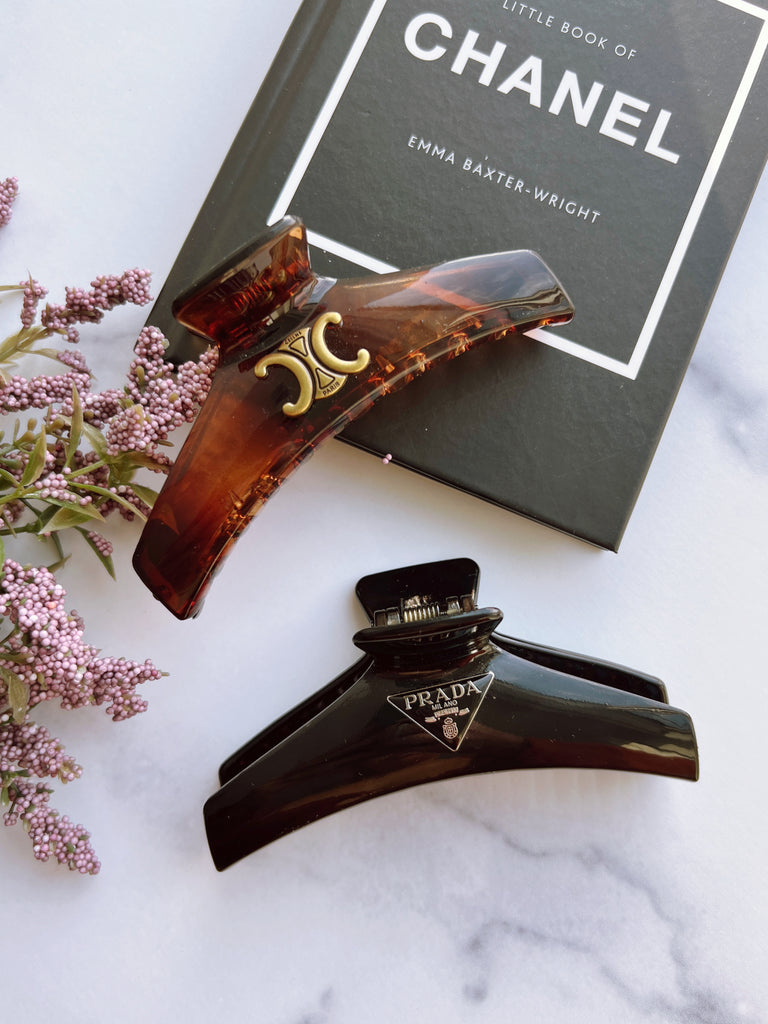 - Two authentic vintage wallet charms repurposed on a black plastic hair claw clip.