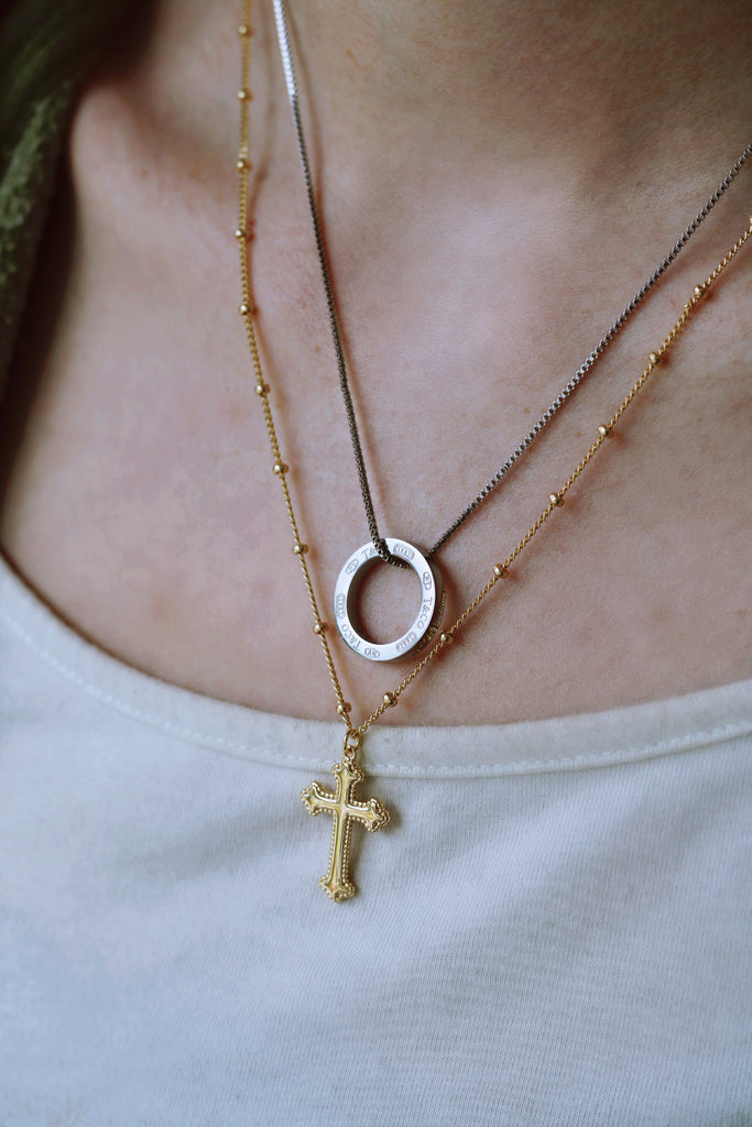 Authentic silver designer charm repurposed on a stainless steel + 18K white gold plated box chain necklace.