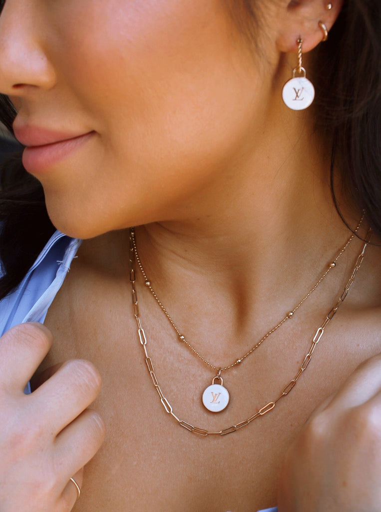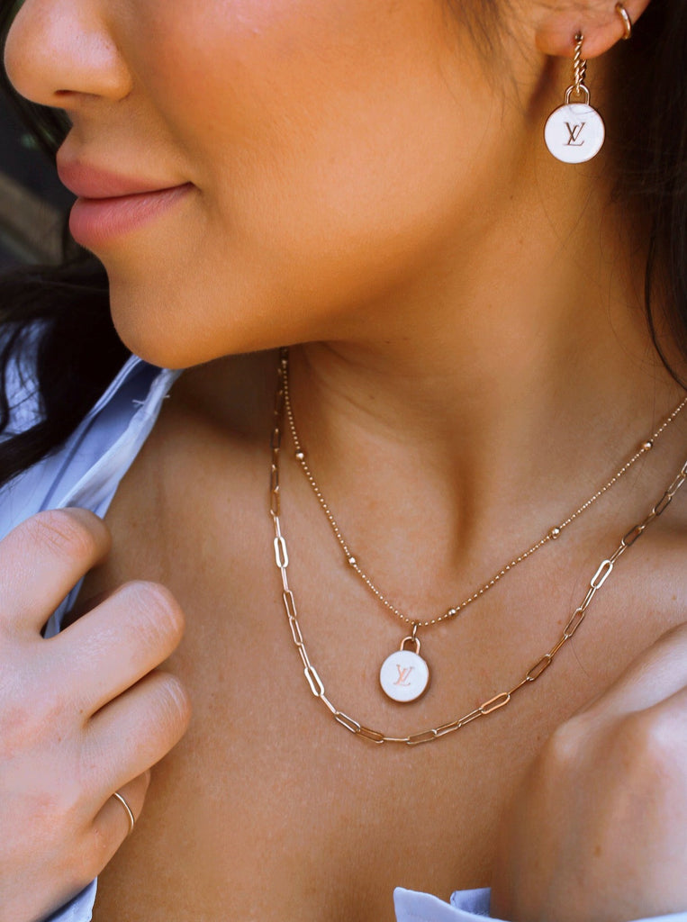 We use authentic designer pieces in our designs. All trademarked materials/charms belong to their respective brands. We are not affiliated with any trademarked brand whose products we recycle, repurpose, and/or refurbish. We do not benefit from the use of the designer materials in any way.