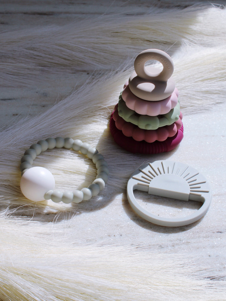 When packing for a day out with your little one don’t forget the bring a fun colorful toy, a soothing teething ring, and an entertaining rattle.