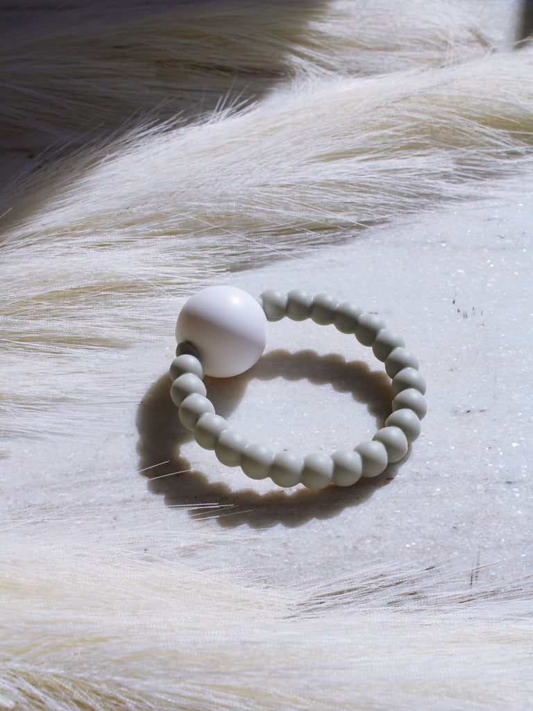 Materials: - 100% food grade silicone teething ring - Plastic rattle ball