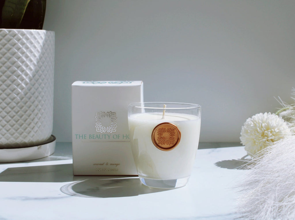 The exotic enticement of coconut blended with the fresh scent of mango give any space the feeling of a tropical oasis. Relax, unwind, and refresh with The Beauty of Hope’s signature Coconut & Mango candle.