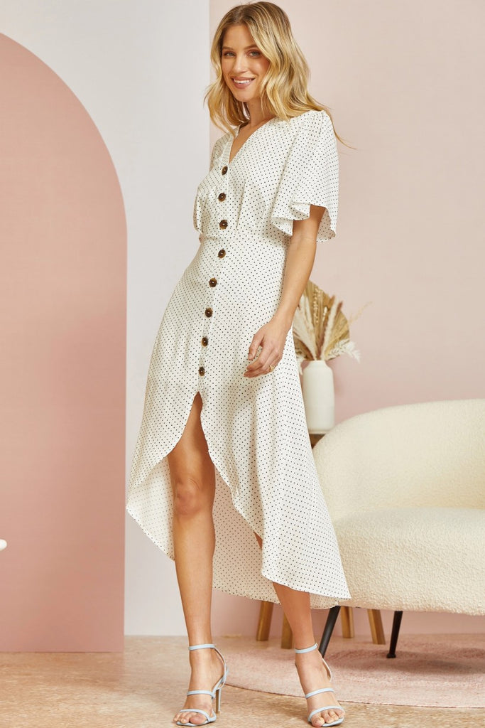 Expertly designed for style and comfort, the JOLIE HALF SLEEVE BUTTON DRESS features intricate button detailing and half sleeves for a charming touch. It's lined, woven fabric ensures a perfect fit and easy movement. Crafted from 100% polyester, this romantic midi dress is a must-have addition to any wardrobe.