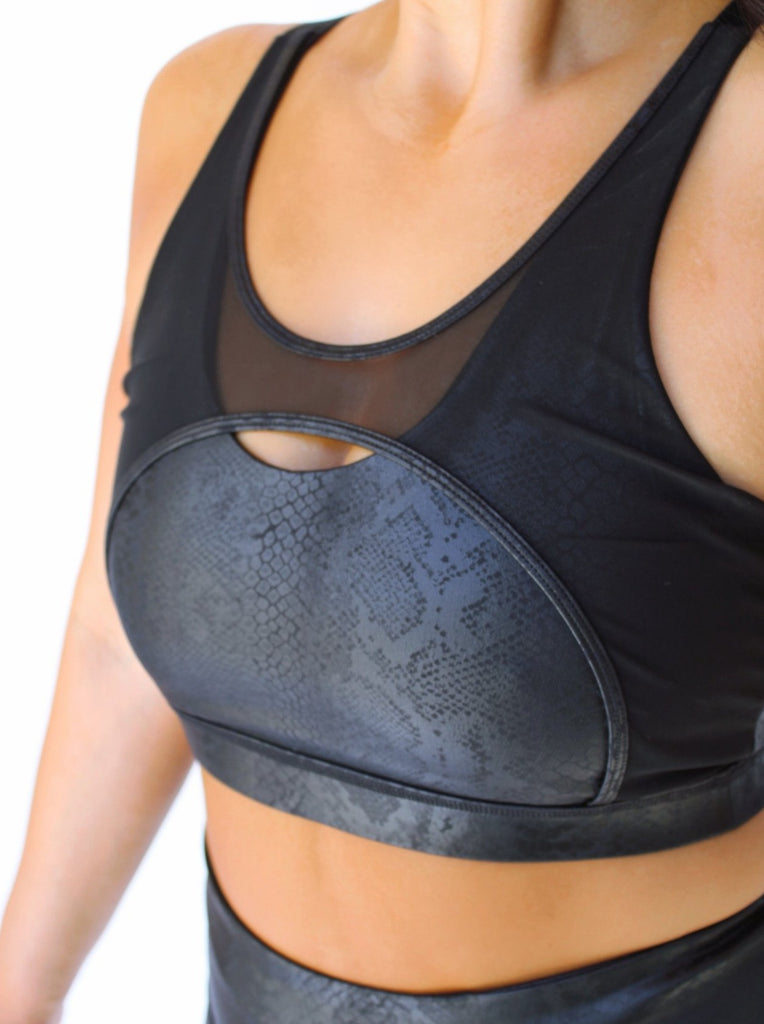 YONCÉ PRINT MESH SPORTS BRA IN BLACK