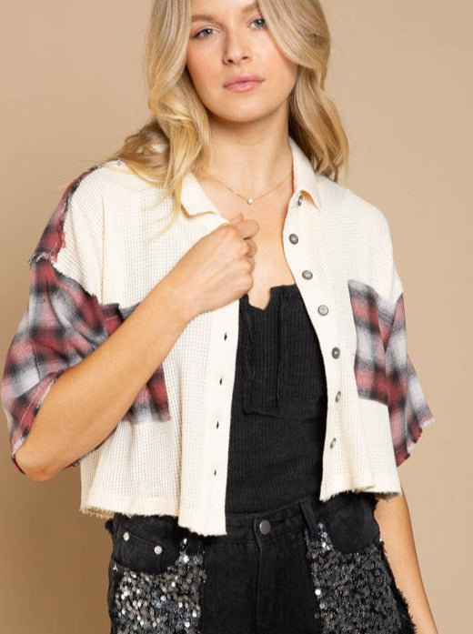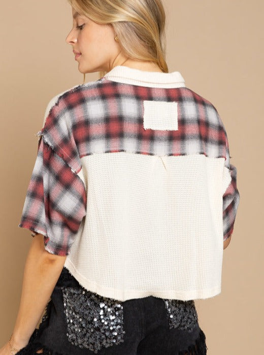 Designed in USA, Plaid Print, with Waffle Knit Style, Frayed Edges, and cute Patch Detailing on Back