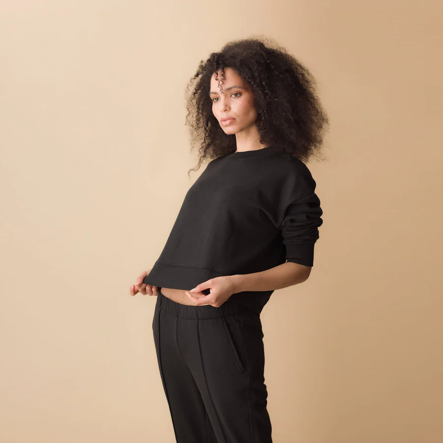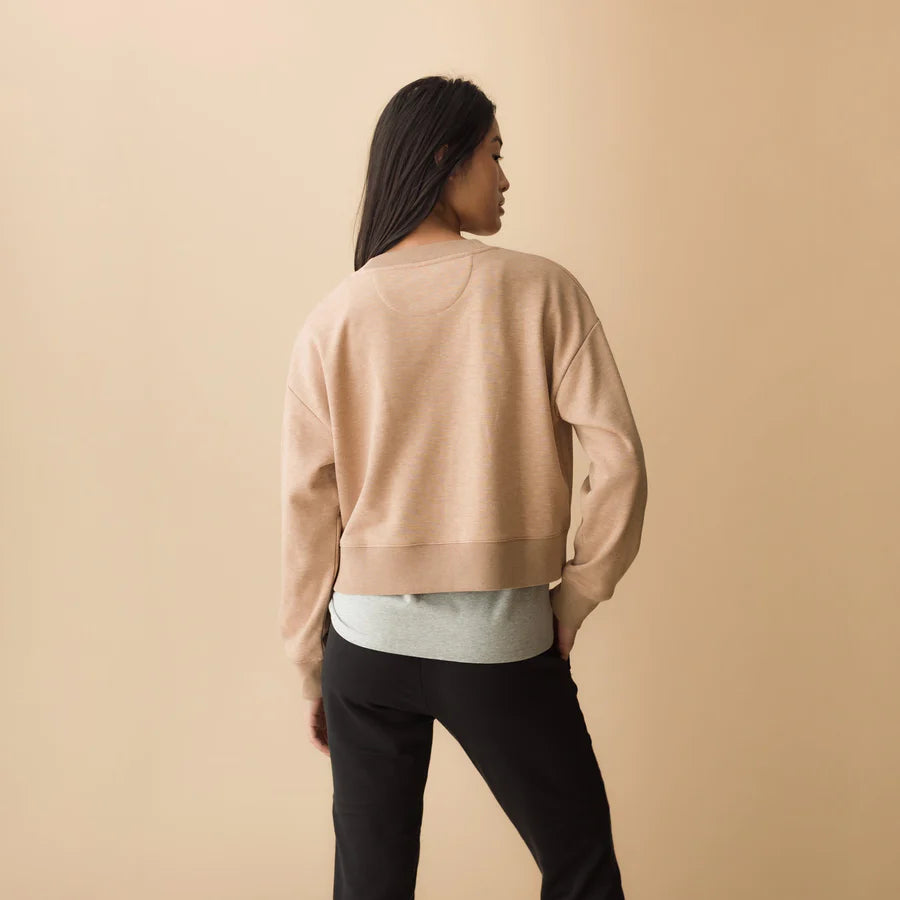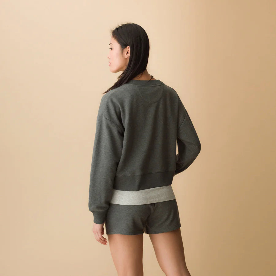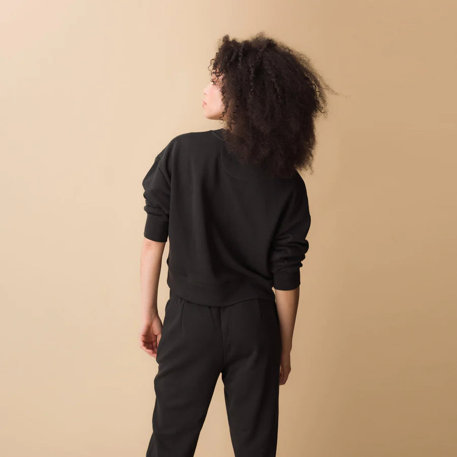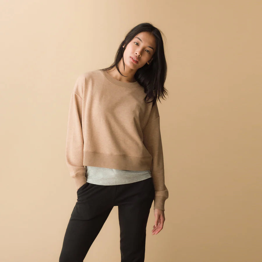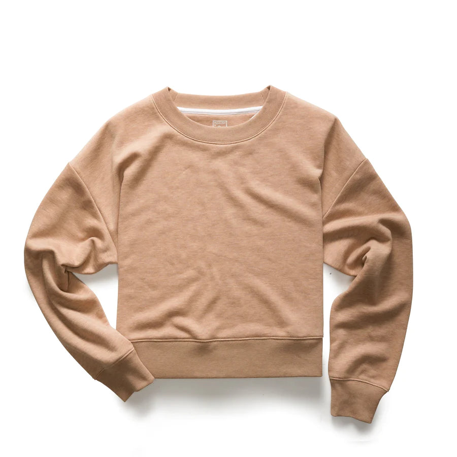This cropped crewneck sweatshirt provides all of the comfort and wearability of our classic sweatshirt sillhouetes, with a stylish and playful spin. Soft and durable French Terry keeps you cozy without weighing you down and a hidden interior pocket makes it easy to stash away your keys and phone.