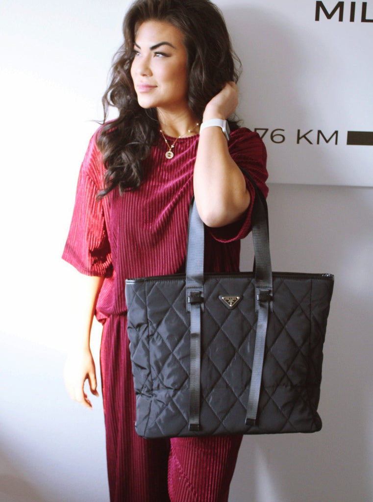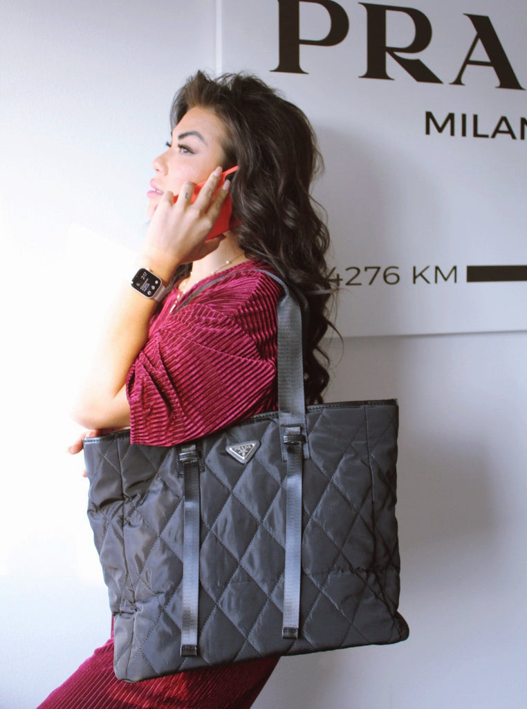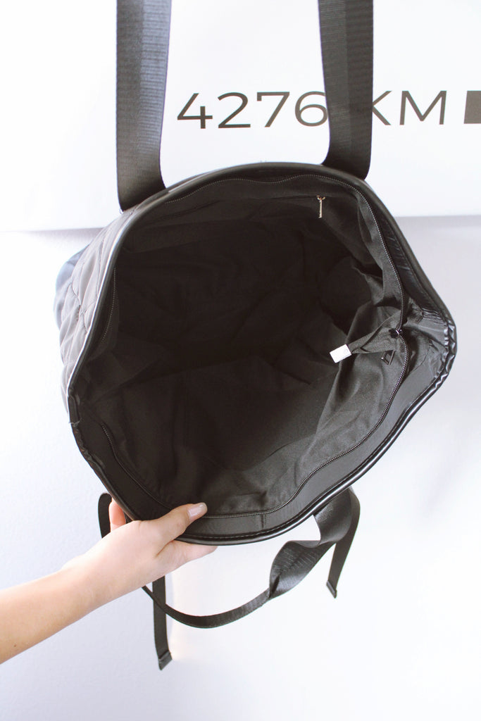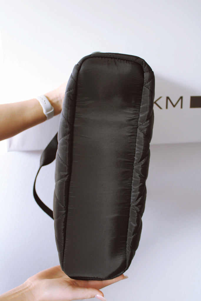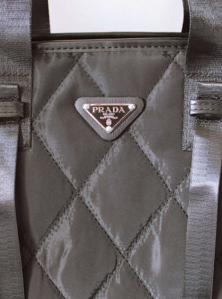Authentic vintage designer charm from used wallet repurposed on a black quilted nylon tote bag. Charm has been added to black faux leather, then added to the tote.