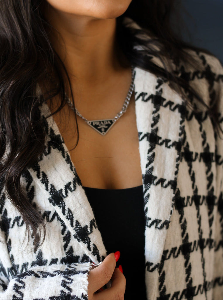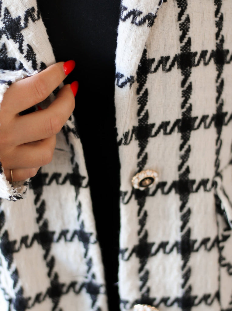 Designed in plaid pattern blazer, relaxed fit, long sleeve with raw edge hem, button down, ornate buttons