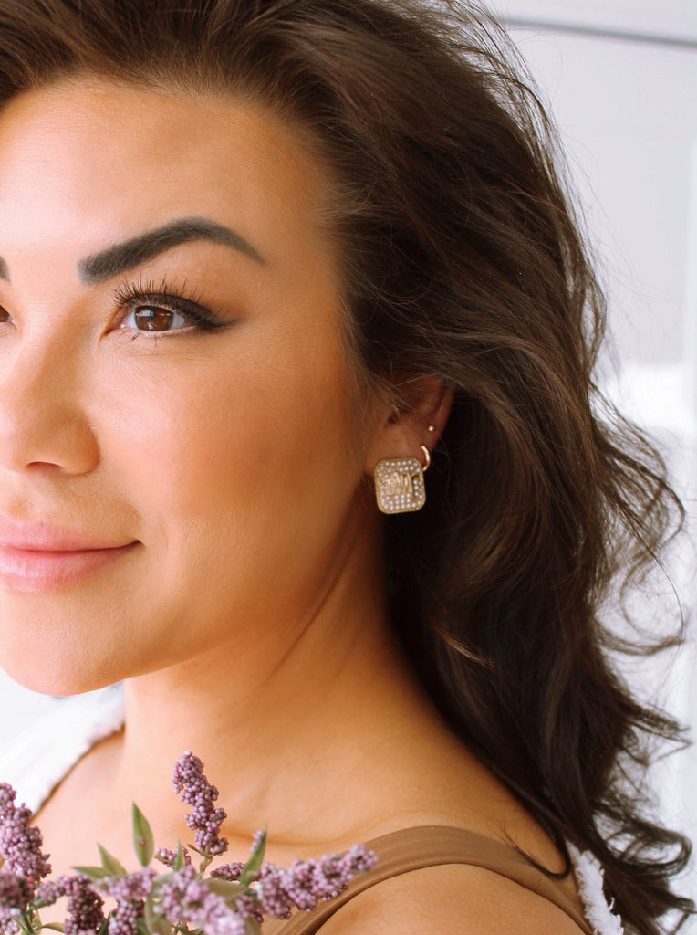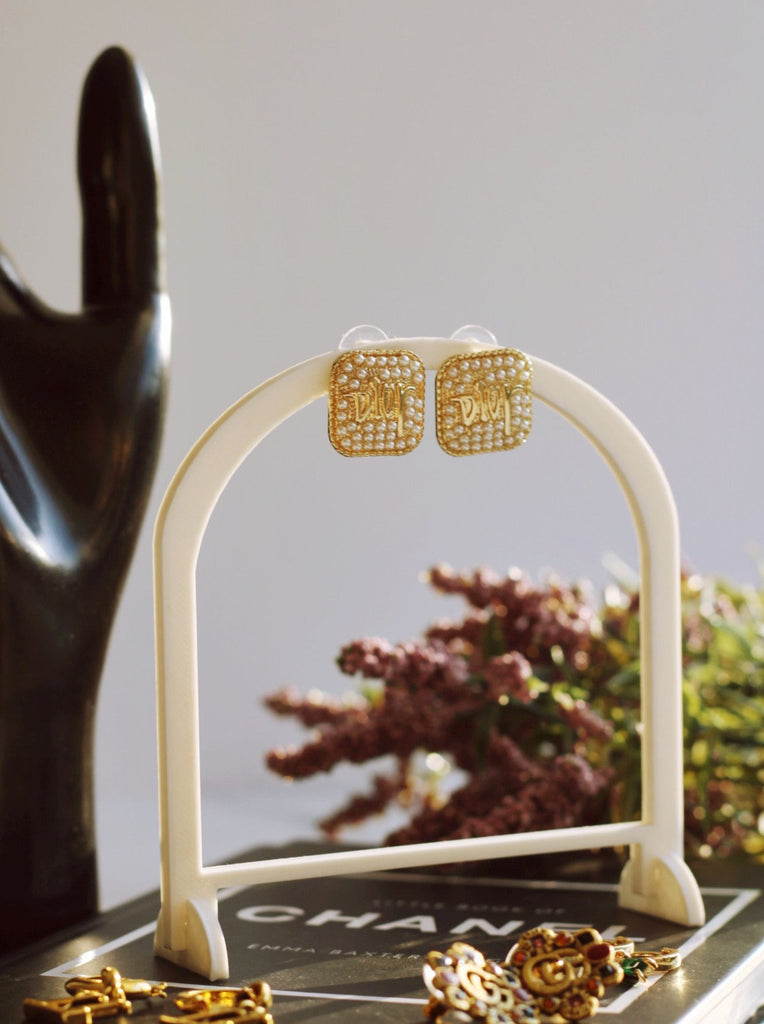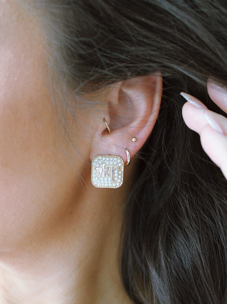 - 2 cm square charms. Tiny pearls surrounding designer script.