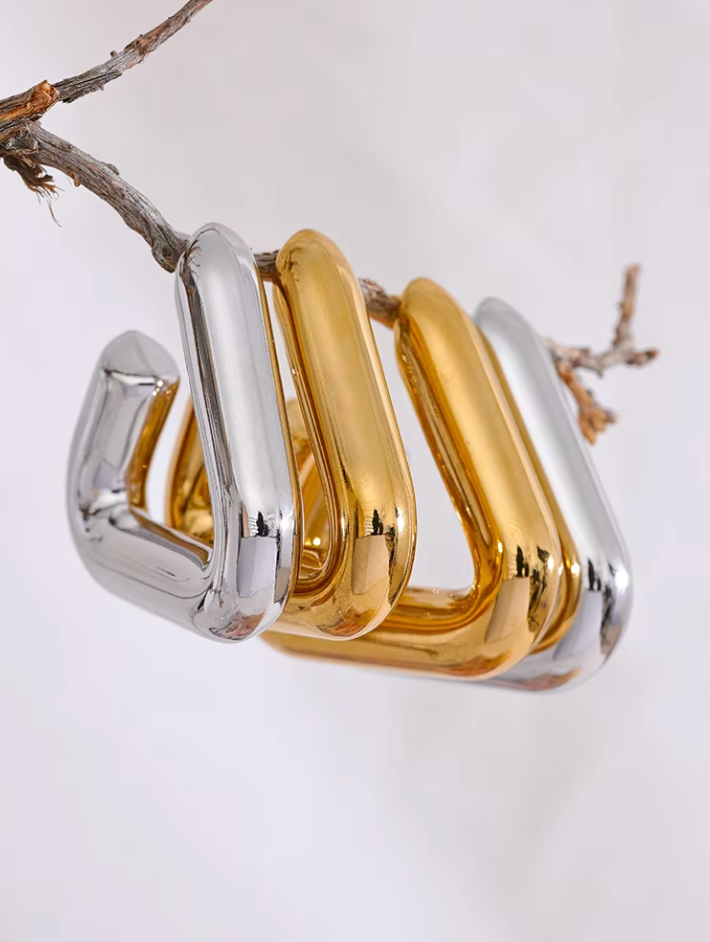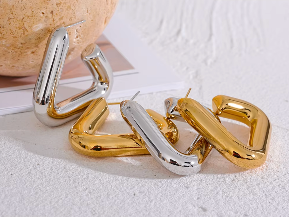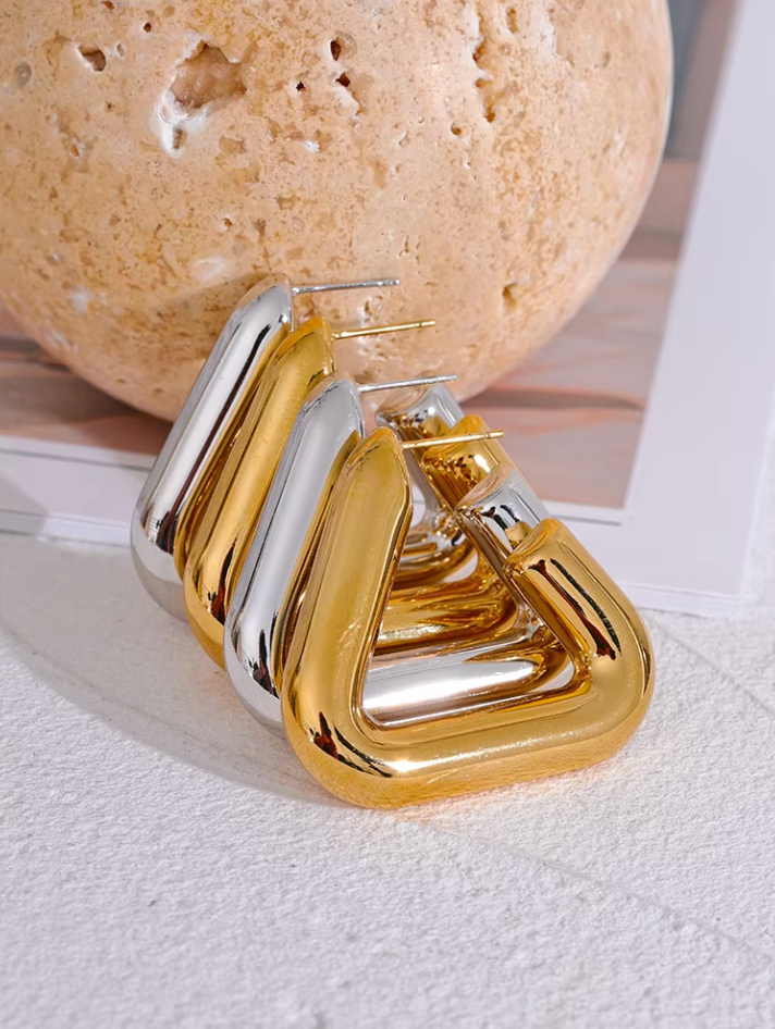 Expertly crafted from stainless steel, these Tatum Triangle Earrings in Gold are not only stylish and edgy, but also waterproof and hypoallergenic. The chunky metal texture adds a unique touch to any outfit, making it the perfect gift for any occasion. And with a brilliant 18K white gold plating, these earrings exude a sophisticated and timeless elegance.
