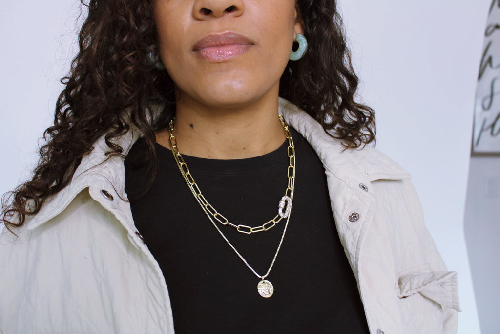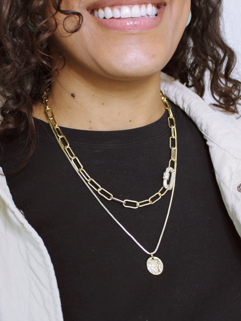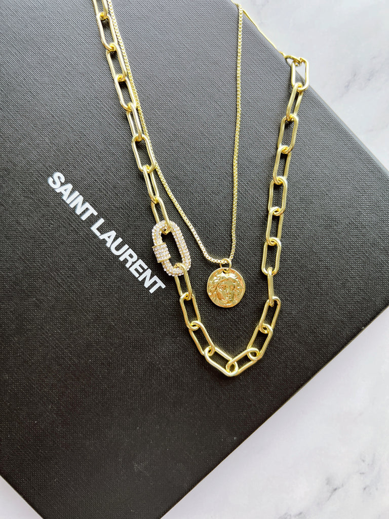 OUR COIN & GLITZ NECKLACE SET COMES WITH A THICK PAPERCLIP CHAIN WITH DAZZLING LOCK DETAIL + CHAIN NECKLACE WITH COIN PENDANT
