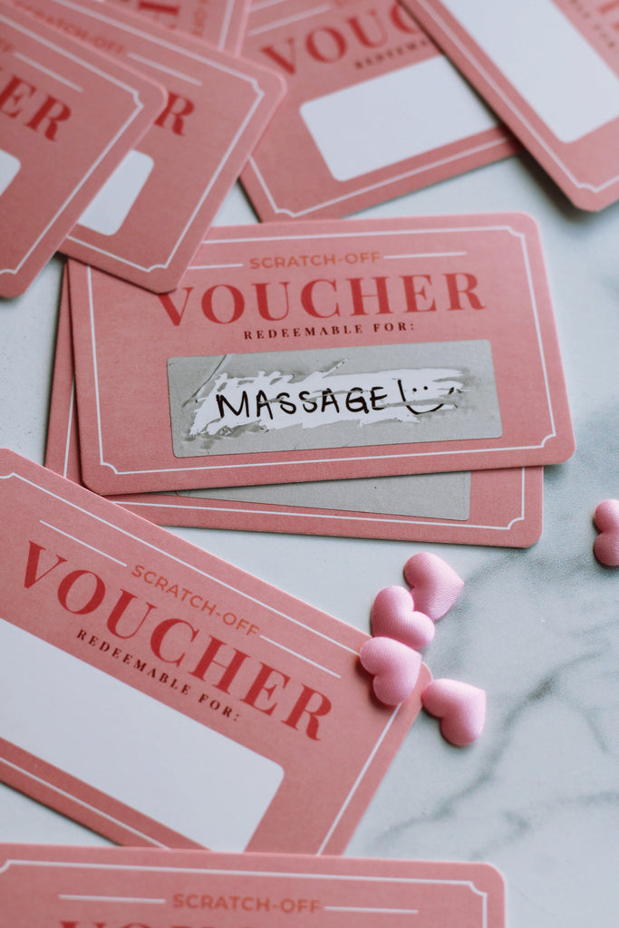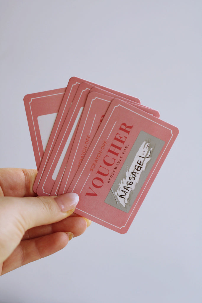 How to use: write your voucher gift on the white space. Then add over the silver scratch-off sticker. Give to your loved one! They will then use a coin to scratch-off the voucher.