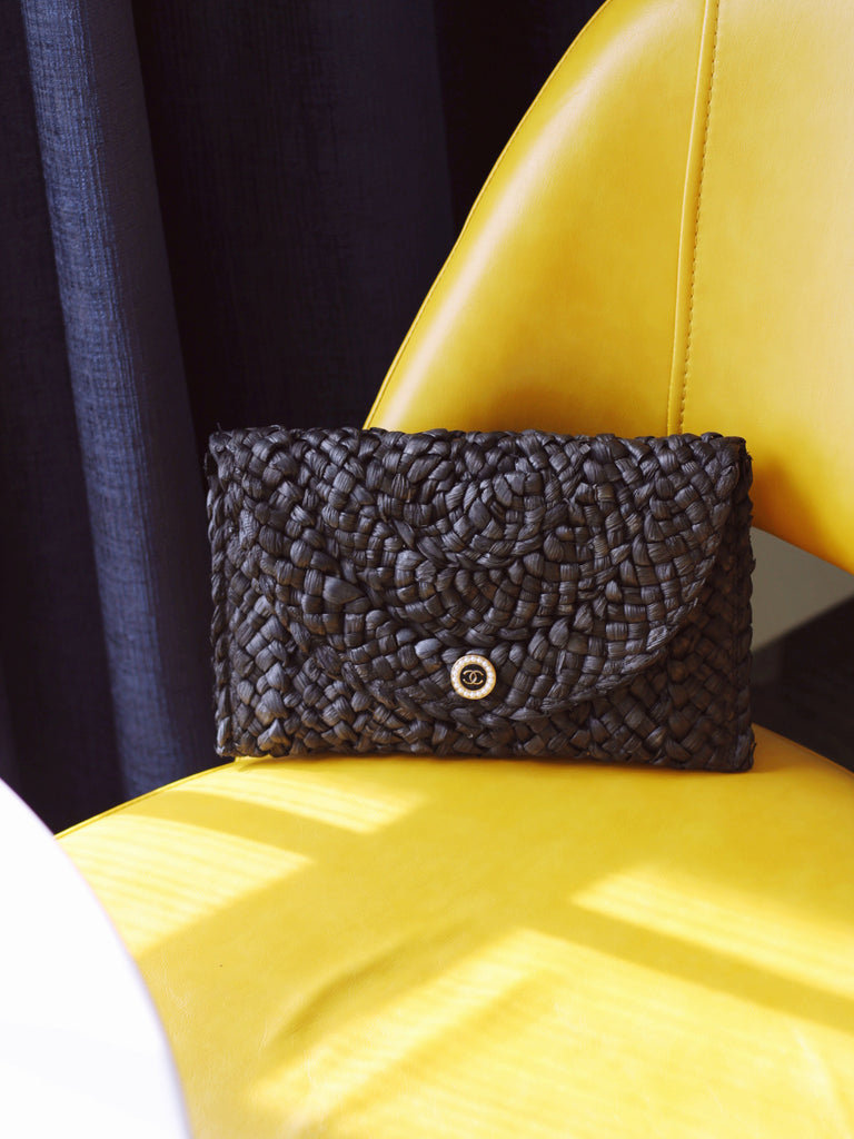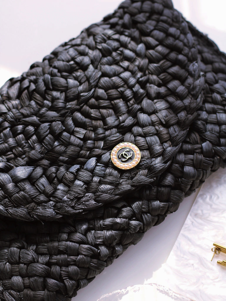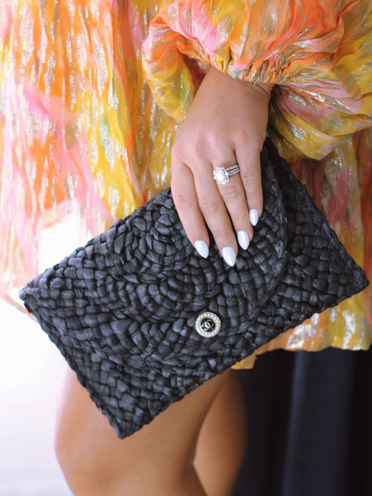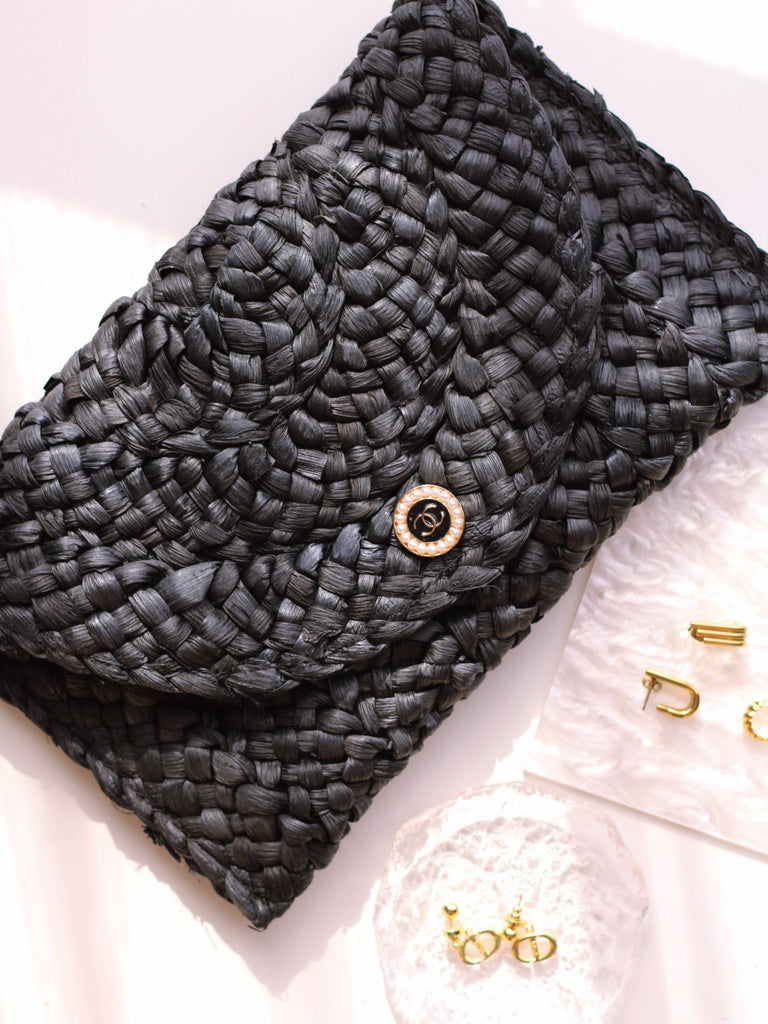 "THE CLUTCH" BLACK FOLD-OVER STRAW BAG