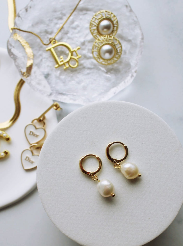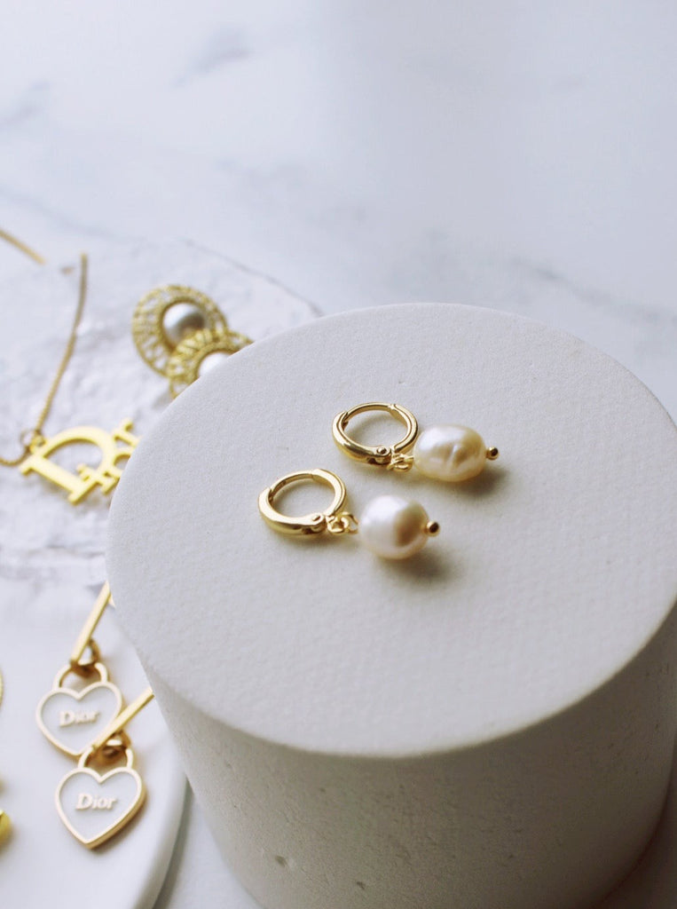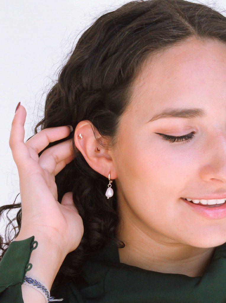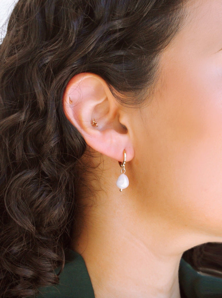 OUR LUCY PEARL DROP (18K GOLD PLATED) ARE PERFECT FOR FIRST OR SECOND HOLES. LIGHTWEIGHT & CHIC.