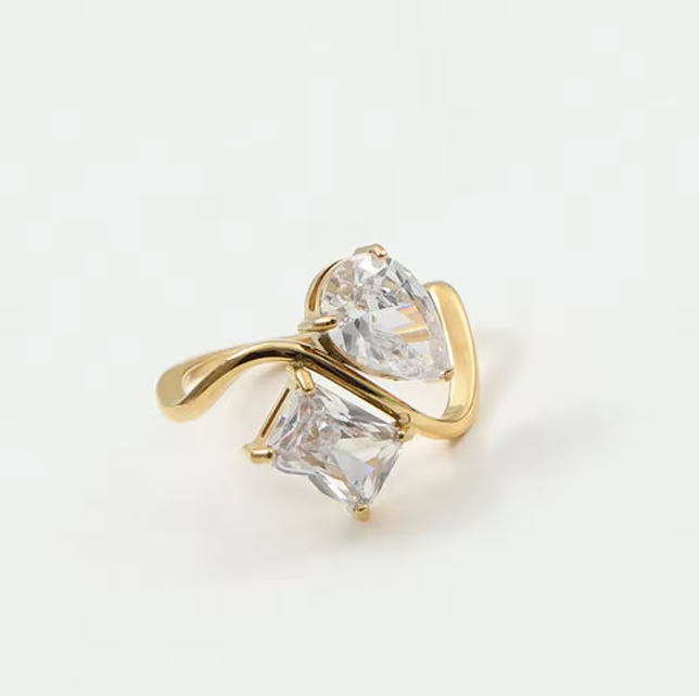Elevate your style with the Kylie Ring, expertly crafted to complement our Kylie Necklace. This statement piece features a vintage-inspired, shiny water drop-shaped and baguette AAA zircon set in durable stainless steel with 18K gold plating, ensuring lasting brilliance without fading. Available in three sizes, it offers a perfect fit while its waterproof design guarantees everyday wearability. Add a touch of glitzy sophistication to any outfit with this timeless accessory.